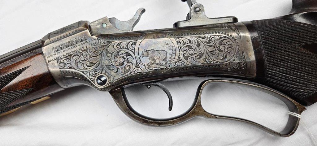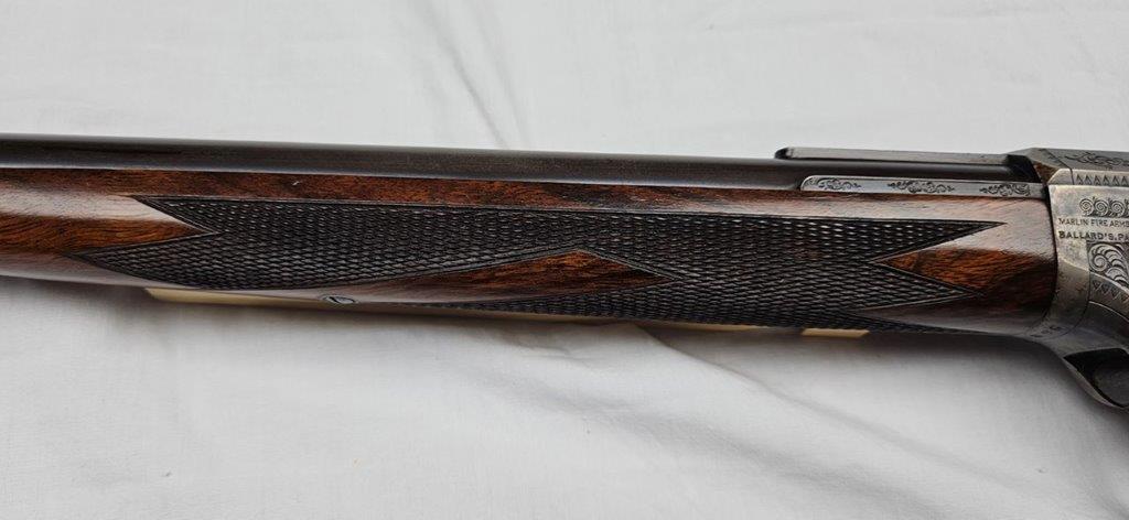 Ballard 6.5 Rigby Special Target Rifle. Schuetzen buttstock, 32-40 Caliber. Deluxe wood, Beautifully Engraved. Case hardening visible.