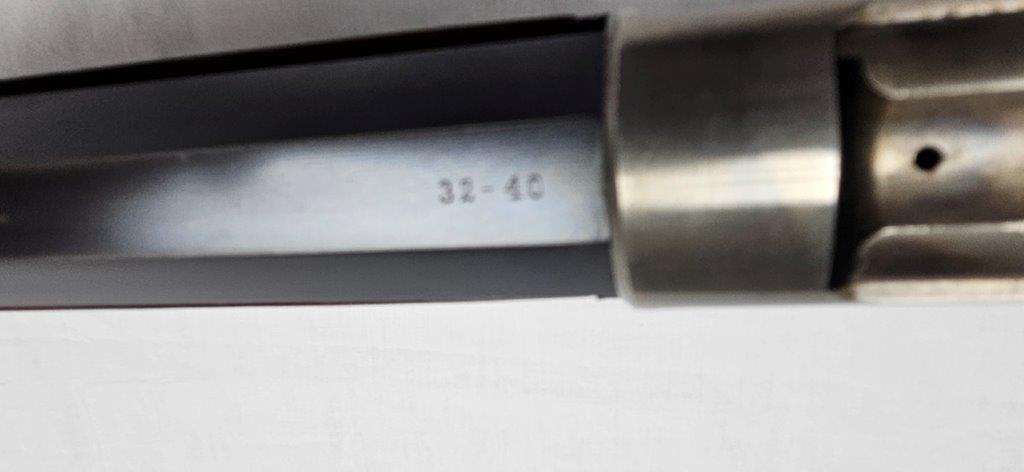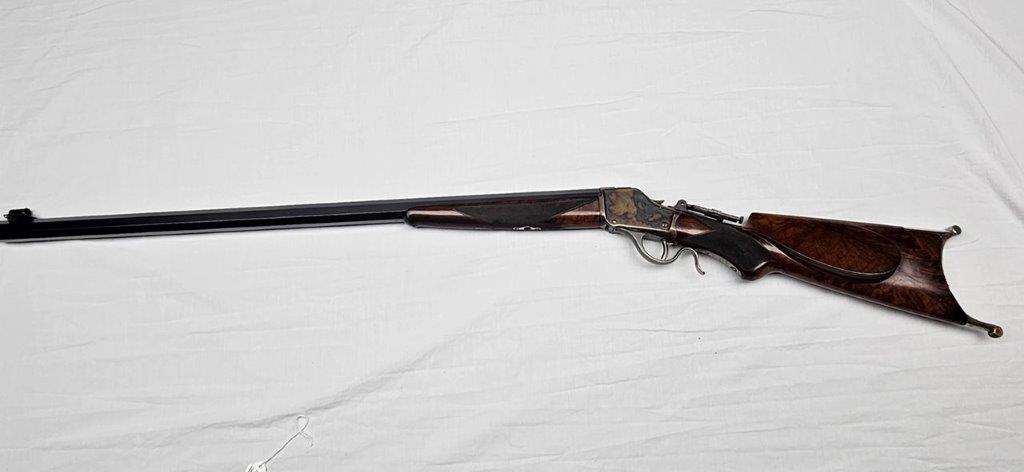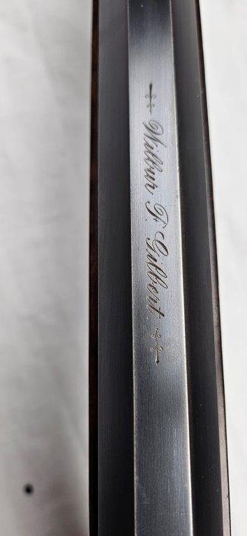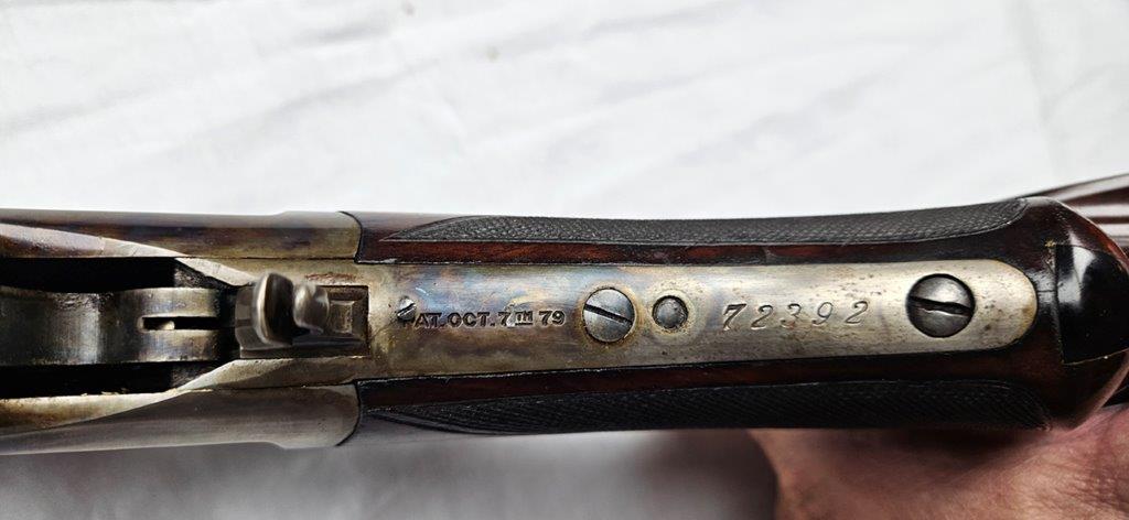 2 trigger, Schuetzen buttstock, target sights, #4 heavy barrel, 32-40 caliber, barrel inscribed “Wilbur F Gilbert”. Stamped “Patent date Oct 7th, 1879”